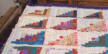 Marica R with St Pats banner, ufo flower and Gray/blue niece's quilt |